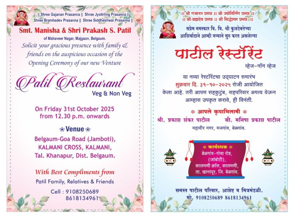 शुक्रवारी सकाळच्या सत्रात पाटील रेस्टॉरंटचे उद्धघाटन होणार आहे. तरी भागांतील नागरीक अप्तेष्ट मित्र मंडळींनी उपस्थीत रहावे असे आवाहन रेस्टॉरंट चे मालक श्री .प्रकाश पाटील व सौ . मनीषा प्रकाश पाटील यांनी केले आहे.