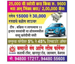 कर्नाटकसह गोवा, महाराष्ट्र राज्यांमध्ये आपली चांगली ओळख निर्माण केलेल्या बेळगांव (उद्यमभाग) येथील कलाश्री बंब स्टील अँड फर्निचर ने आणखी एक विशेष योजना आणण्यात आली आहे. 25 हजारची खरेदी करा आणि जिंका आकर्षक बक्षिसे! यामध्ये पहिले बक्षीस कार किंवा 2 लाख कॅश मिळणार असून, त्याचबरोबर 15 ते 30 हजार रुपयाचे बक्षीस व्हाउचर देण्यात येणार आहे.