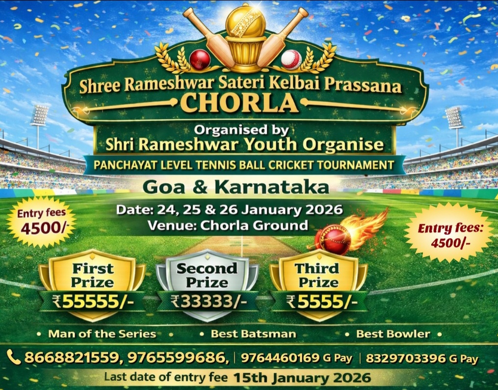 चोर्ला (ता. खानापूर) येथील श्री रामेश्वर युथ ऑर्गनायझ यांच्यावतीने 24 ,25, 26 जानेवारी रोजी पंचायत लेवल क्रिकेट स्पर्धेचे आयोजन करण्यात आले आहे. यातील विजेत्याला 55 हजार 555, 33333, 555 अशी बक्षीसे देण्यात येणार आहेत, असे सामाजिक कार्यकर्ते कृष्णा गावकर यांनी कळविले आहे..