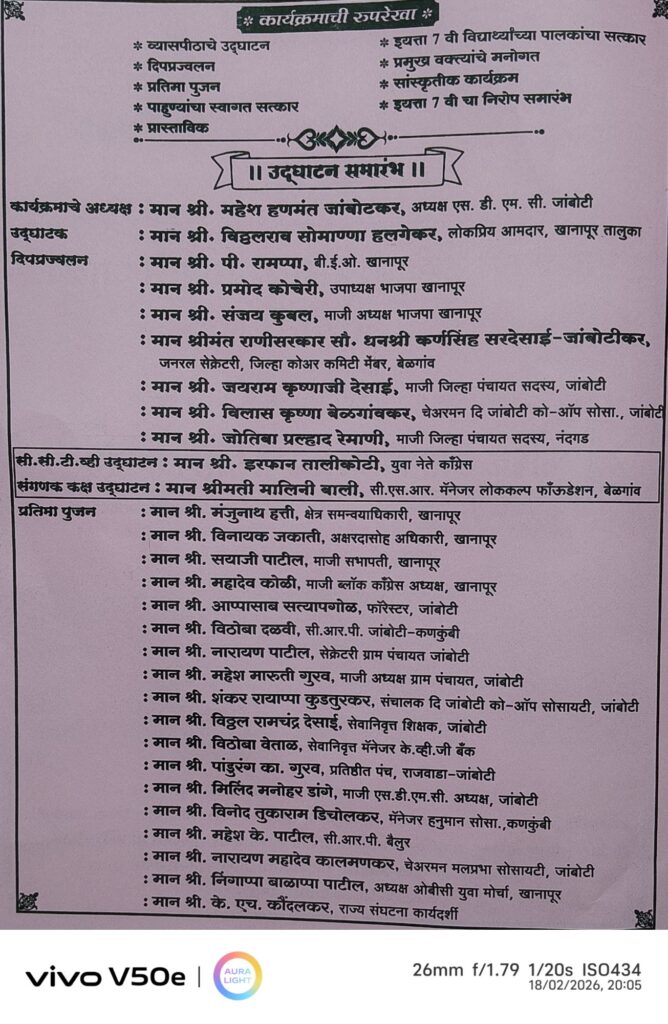 यावेळी शाळा सुधारणा समिती अध्यक्ष महेश जांबोटकर यांच्या अध्यक्षतेखाली हा कार्यक्रम पार पडणार असून, तालुक्याचे लोकप्रिय आमदार विठ्ठल सोमांना हलगेकर, तालुका शिक्षणाधिकारी पी. रामाप्पा, जिल्हा भाजप उपाध्यक्ष प्रमोद कोचेरी, माजी तालुका भाजप अध्यक्ष संजय कुबल, भाजप नेत्या धनश्री सरदेसाई, माजी जिल्हा पंचायत सदस्य व म. ए. समिती नेते जयराम देसाई, म. ए. समिती नेते व जांबोटी सोसा. संस्थापक -अध्यक्ष विलास बेळगावकर, माजी नंदगड जि. पं. सदस्य जोतिबा रेमानी या मान्यवरांच्याहस्ते उद्घघाटन व दीपप्रज्वन पार पडेल. काँग्रेस युवा नेते यांच्याहस्ते सी सी टीव्हीचे उद्धघाटन इरफान तालीकोटी व लोककल्प फाउंडेशनच्या सी. एस. आर मॅनेजर मालिनी वाली यांच्याहस्ते संगणक कक्षाचे उद्धघाटन होईल.