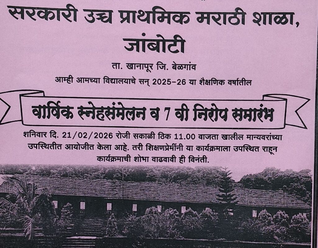 निरोप घेताना शाळेचा आज डोळे आले भरुनी! अन् शाळेतील दिवस बनले स्मरणातील पुस्तकातील पाणे! निरोपाचा क्षण जणू हळव्या त्या फुलांचा, आठवणींची गर्दी जणू क्षण हा विरहाचा! अशा या भावनिक ओळी आहेत, सातवीच्या विद्यार्थांच्या! काय वर्णू माझ्या शाळेची महती, आम्हीं सर्वजण मिळून शाळेचीच गाणी गाती असे ते विद्यार्थी विद्यार्थिनींचे स्वर काणी पडती! शनिवारचा दिवस ठरेल आमच्या स्मरणाचा.... शनिवार दिनांक 21 रोजी सकाळी 11 वाजता. जांबोटी विभागातील केंद्र आणि जुनी शाळा म्हणून ओळखल्या जाणाऱ्या जांबोटी मायमराठी उच्च प्राथ.मराठी शाळेचे स्नेहसंमेलन व सातवीच्या विद्यार्थ्यांना निरोप समारंभ अशा दुहेरी आठणींच्या कार्यक्रमांचे आयोजन करण्यात आले आहे.